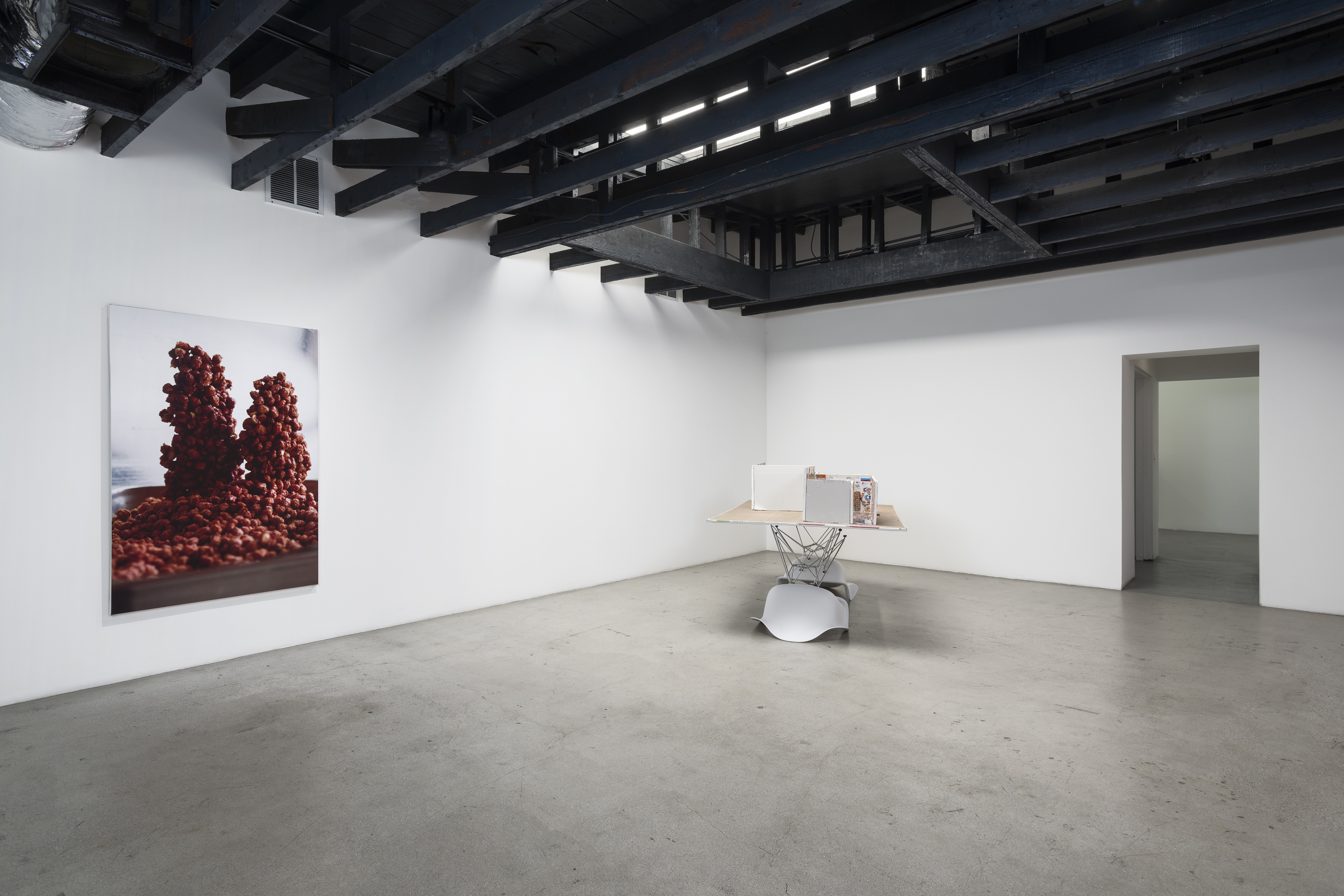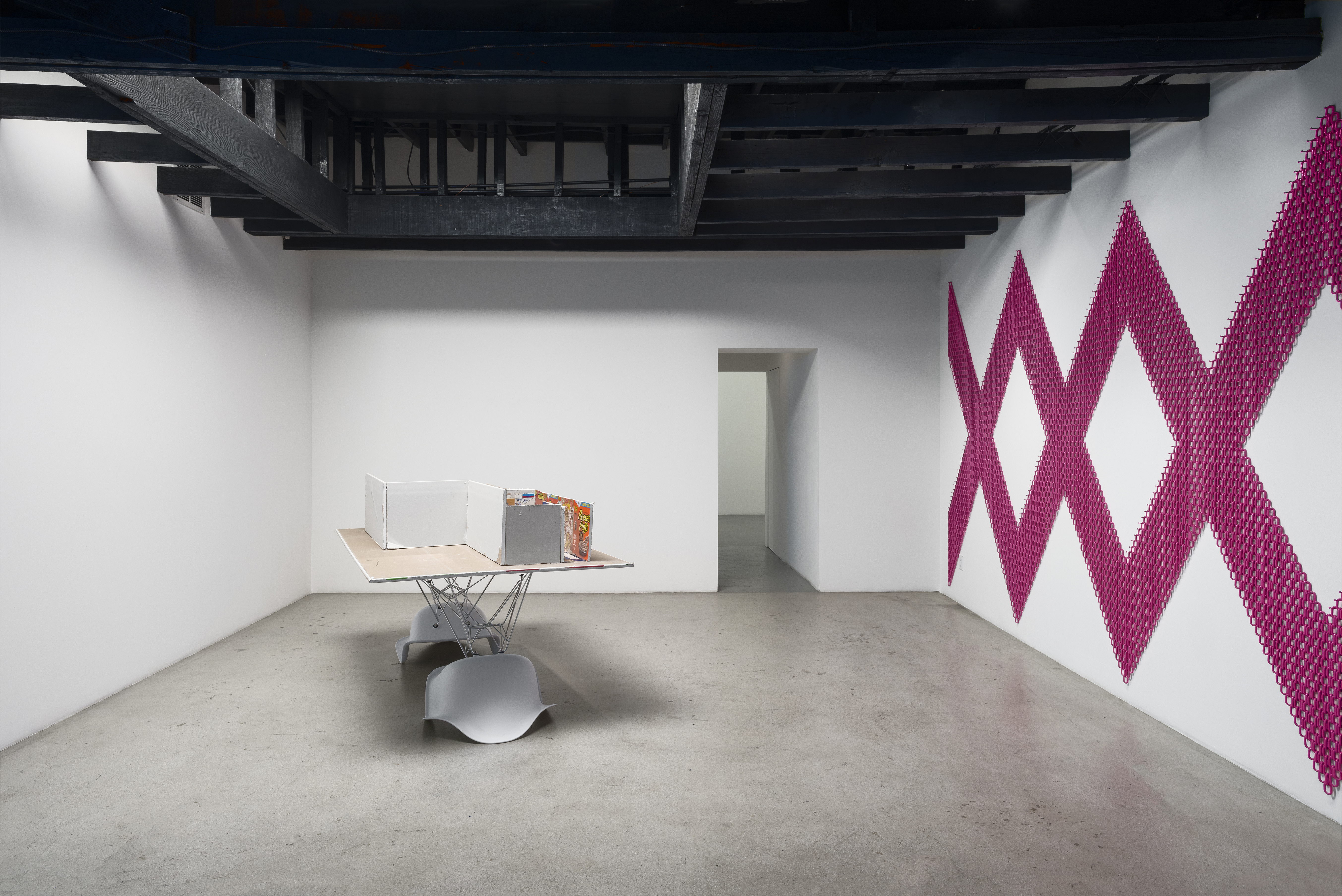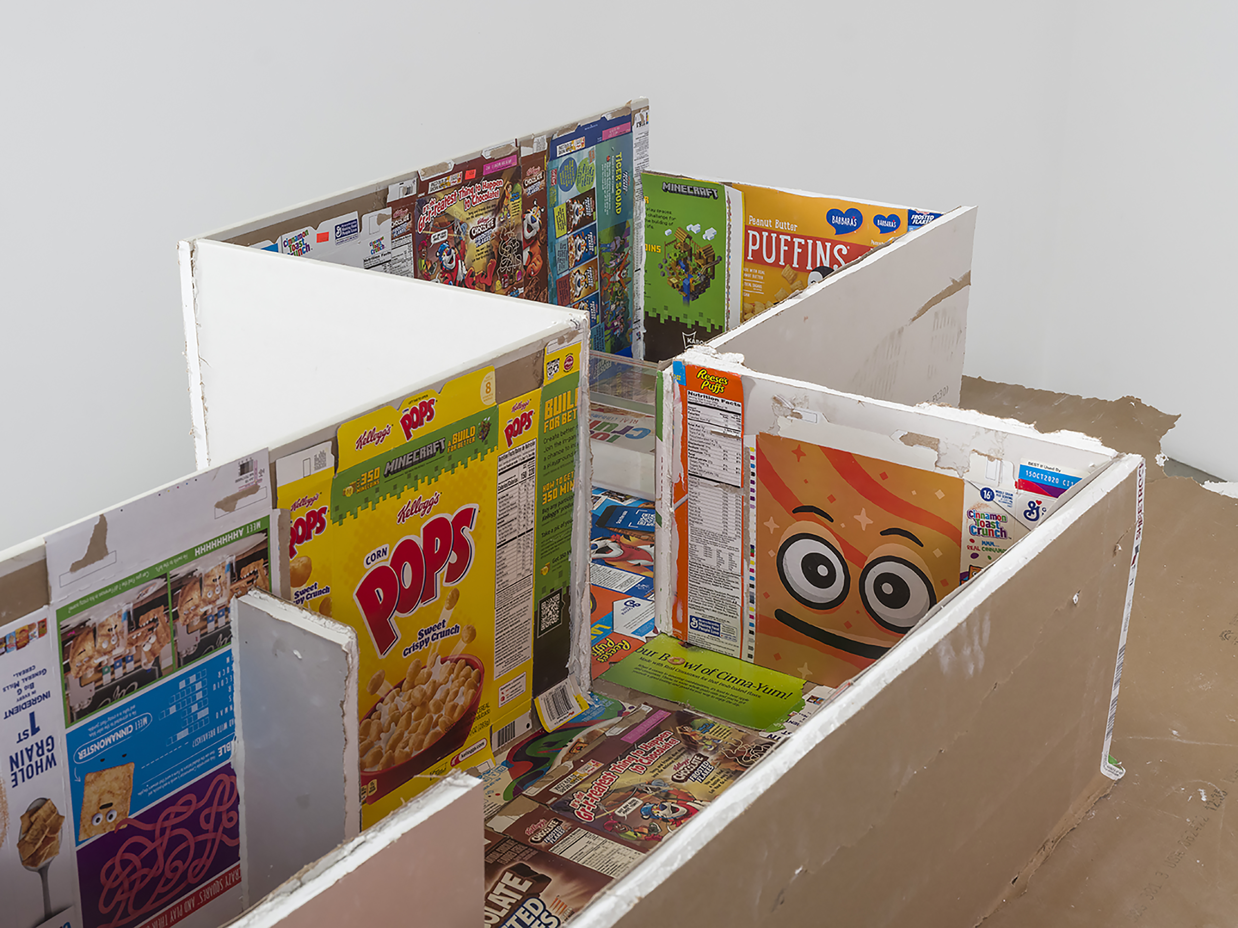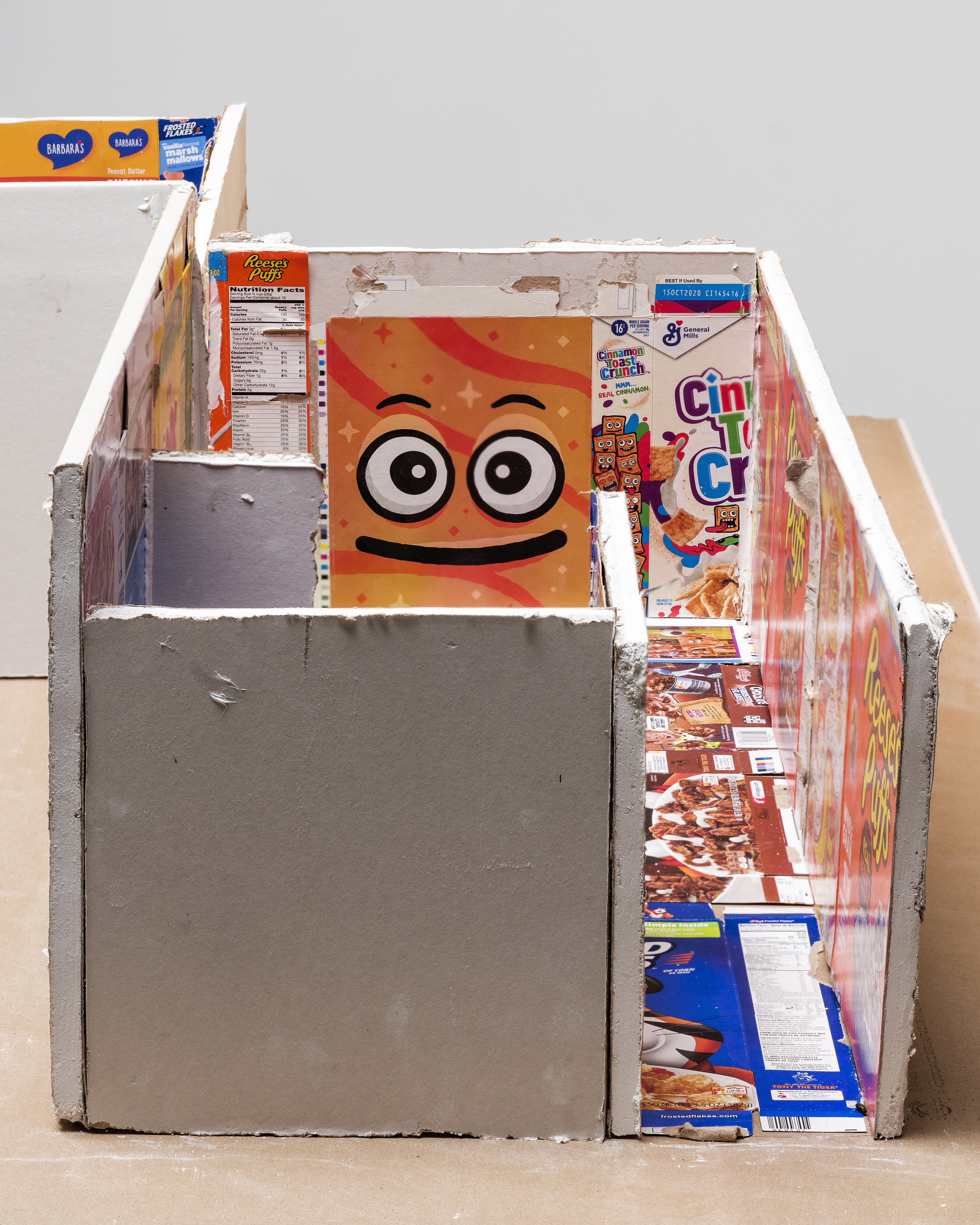 Drywall, cereal boxes, adhesive, used rodent euthanasia chamber, replica Eames chairs
